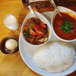 2種カレー、フィッシュと野菜ダルカレー、温玉付き。中辛のダルカレーにピリ辛スパイシーなフィッシュカレー。どちらも美味しいが個人的にはフィッシュカレー。ライスは日本米で食べやすかった。日本向けに作った絶品カレー。
